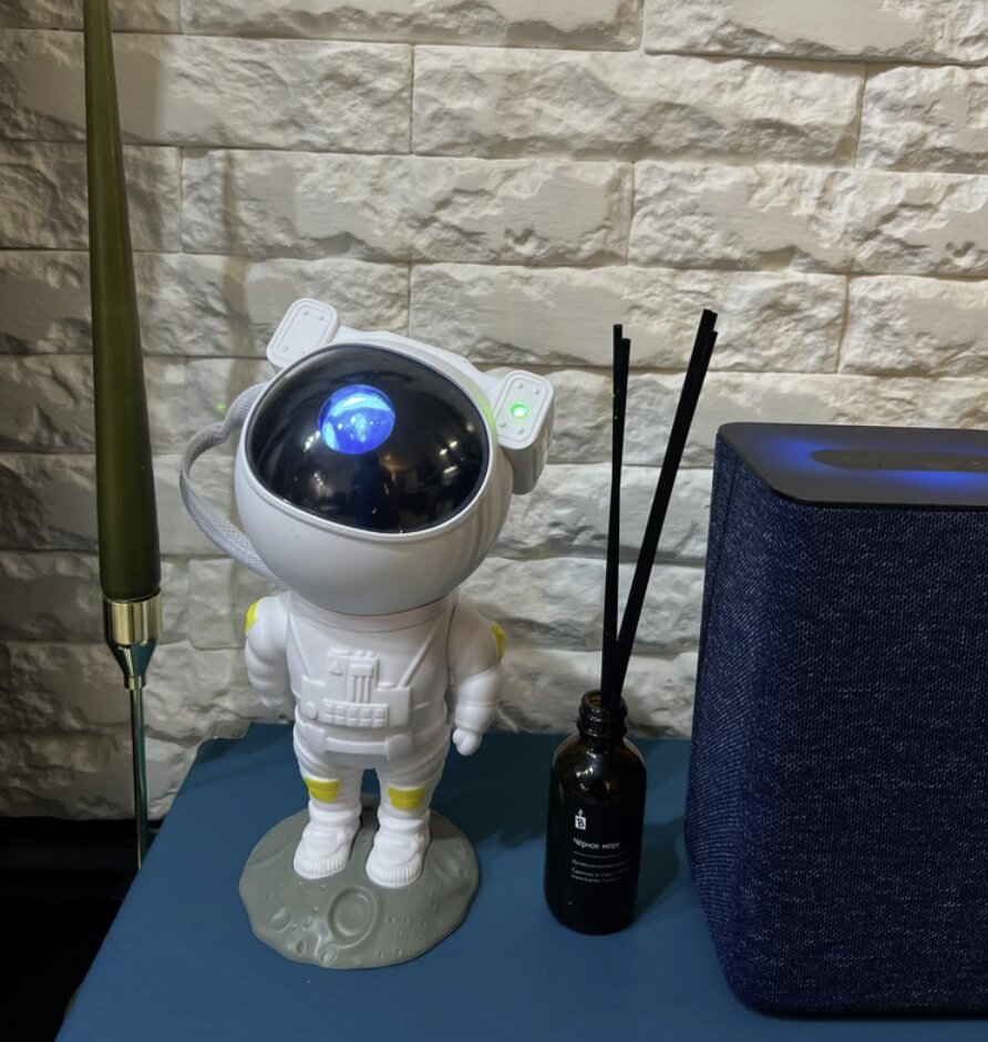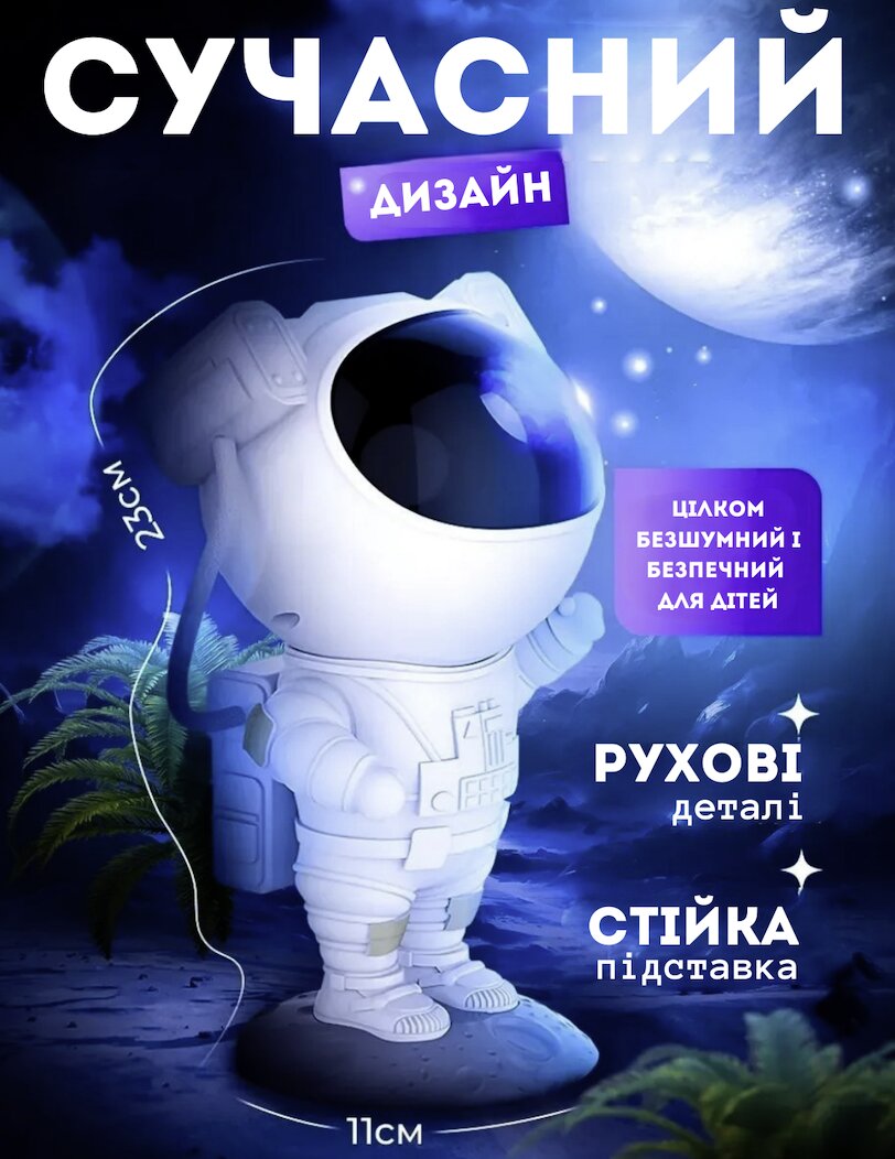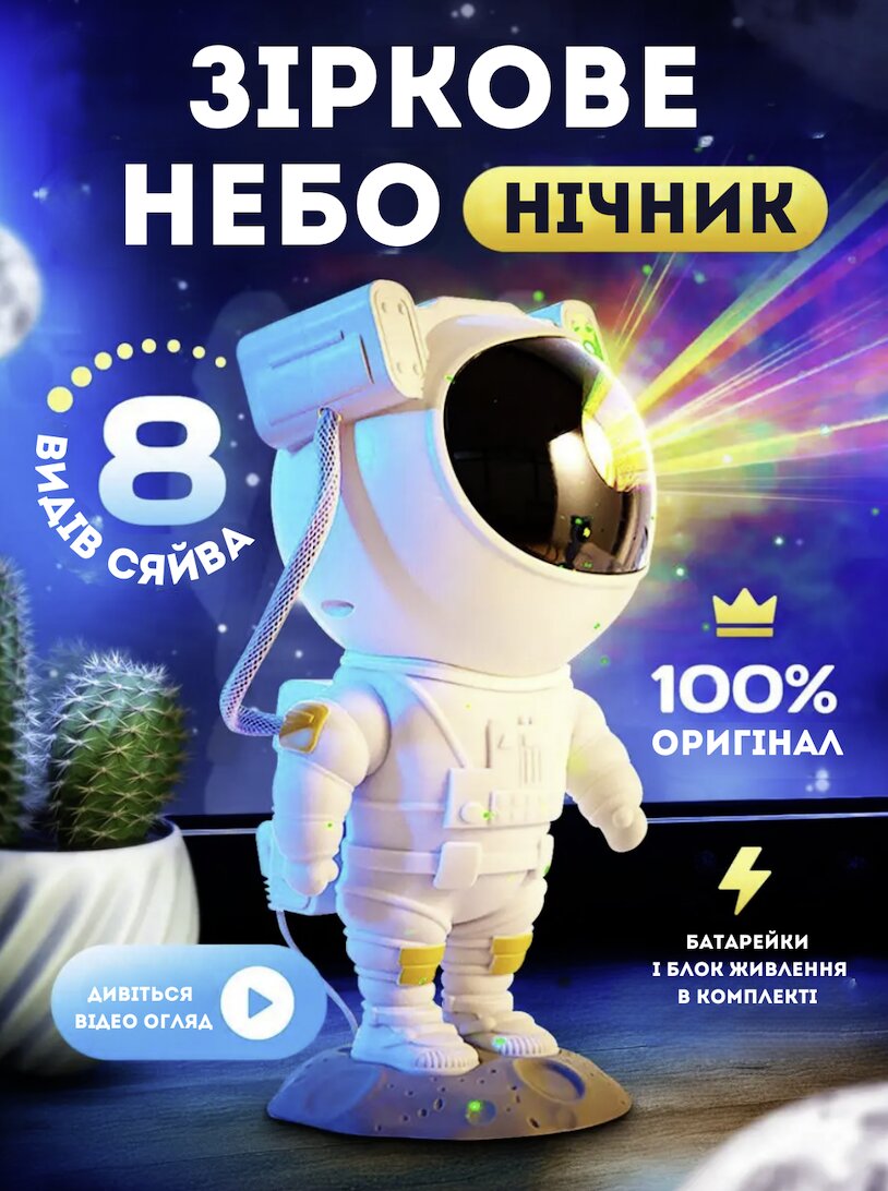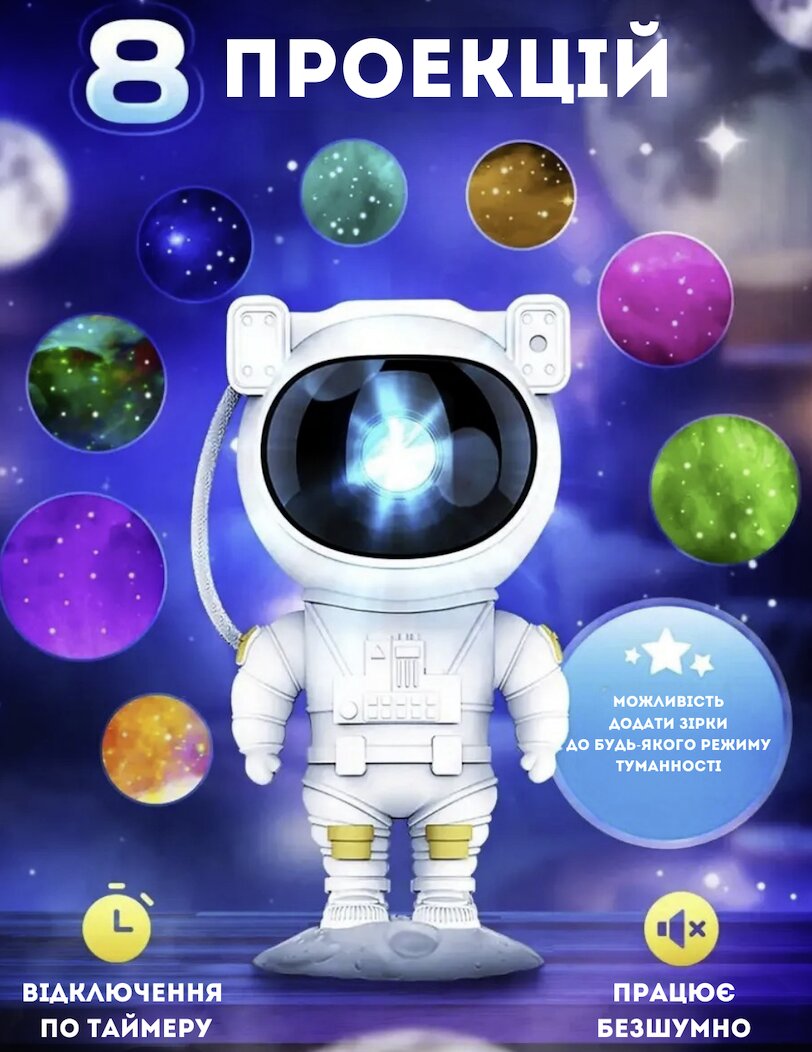 Нічник - це вражаючий інтерьєрний аксесуар, який приносить у ваш простір чарівний космічний настрій. Цей унікальний нічник виготовлений у вигляді милого космонавта і освітлює вашу кімнату неймовірним зірковим небом.